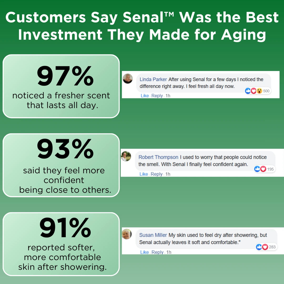 Thousands of customers report noticeable improvements within 30 days using Senal™, powered by Noneal Reset Technology™ — designed to help neutralize aging odor at the source and restore the confidence of feeling truly fresh again.