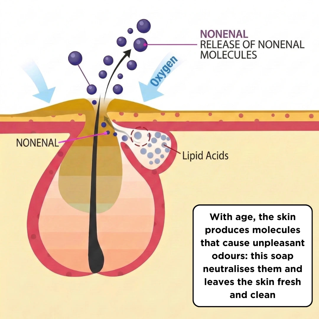 Starting around age 40, your skin begins producing 2-nonenal — an oil-based compound linked to what many people describe as aging odor. Because it binds to the skin’s lipid layer, it can cling to skin, clothing, and bedding.